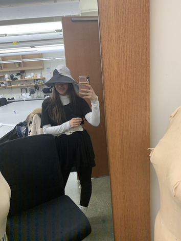 This hat consists of a four-piece sectional crown, silk lining, and an asymmetric brim - high on the left, low on the right.